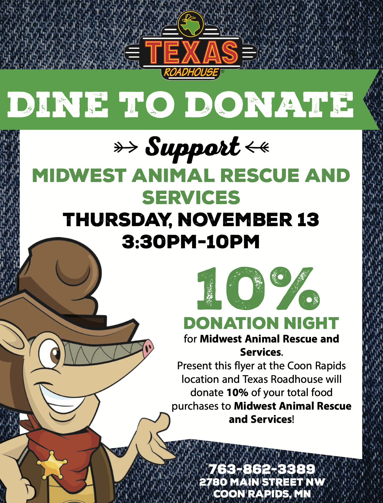 Show the fundraiser flyer (digital or printed) when you dine at the Coon Rapids Texas Roadhouse on November 13, and 10% of your total food purchases will be donated to Midwest Animal Rescue & Services (MARS).