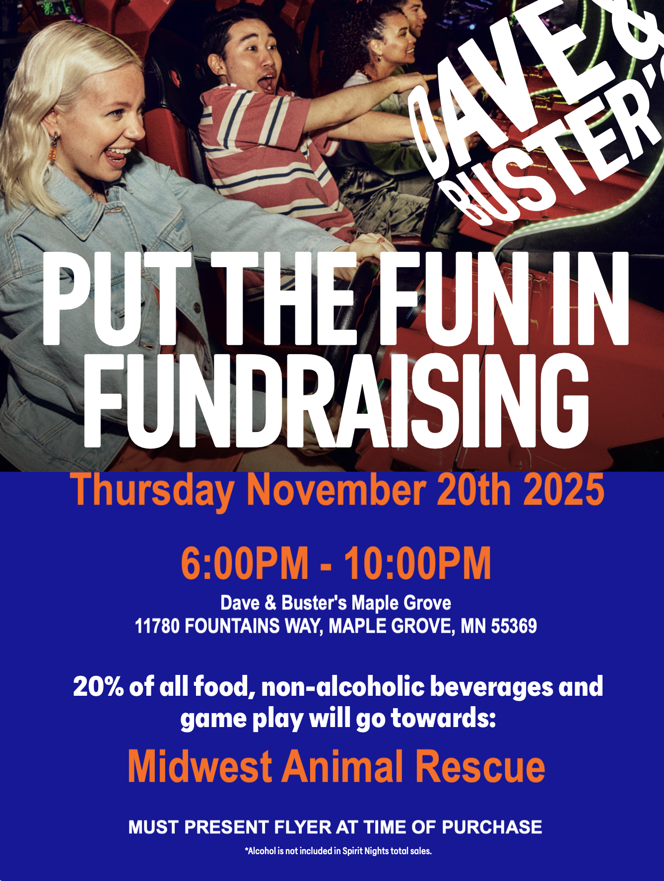 Join Midwest Animal Rescue & Services (MARS) for a fun night out to celebrate Give to the Max Day! We’re wrapping up this statewide day of giving with an evening full of food, games, and community at Dave & Buster’s in Maple Grove.